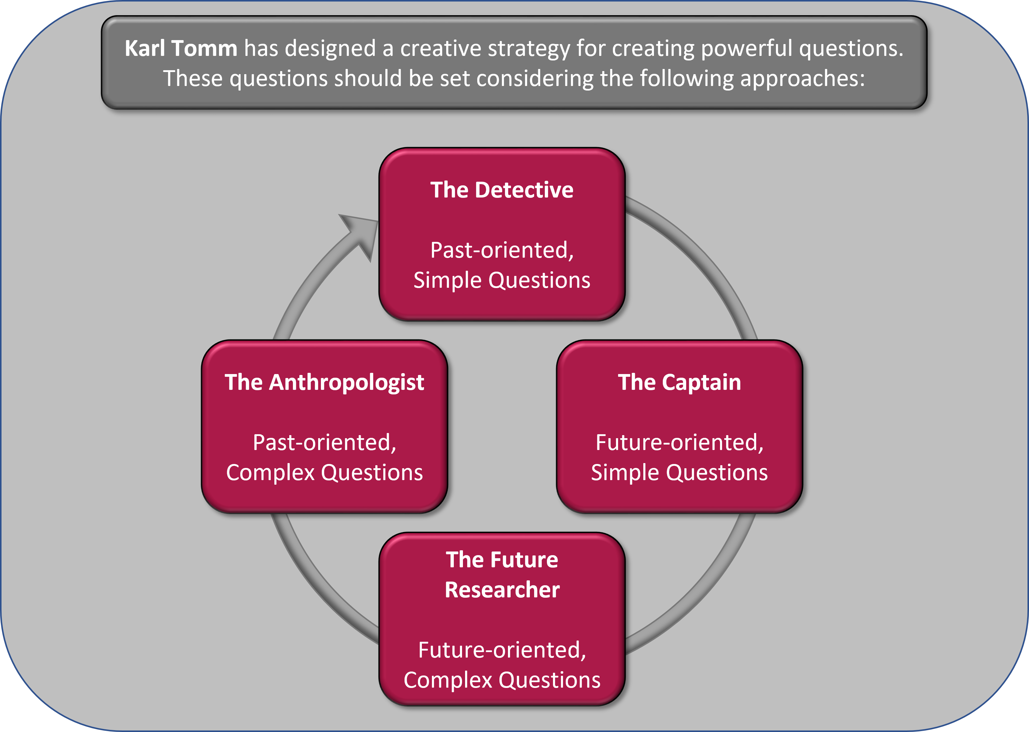 One can use Karl Tomm's model for asking powerful questions to the coachee. He has designed a creative strategy for creating powerful questions. These questions should be set considering the following approaches: