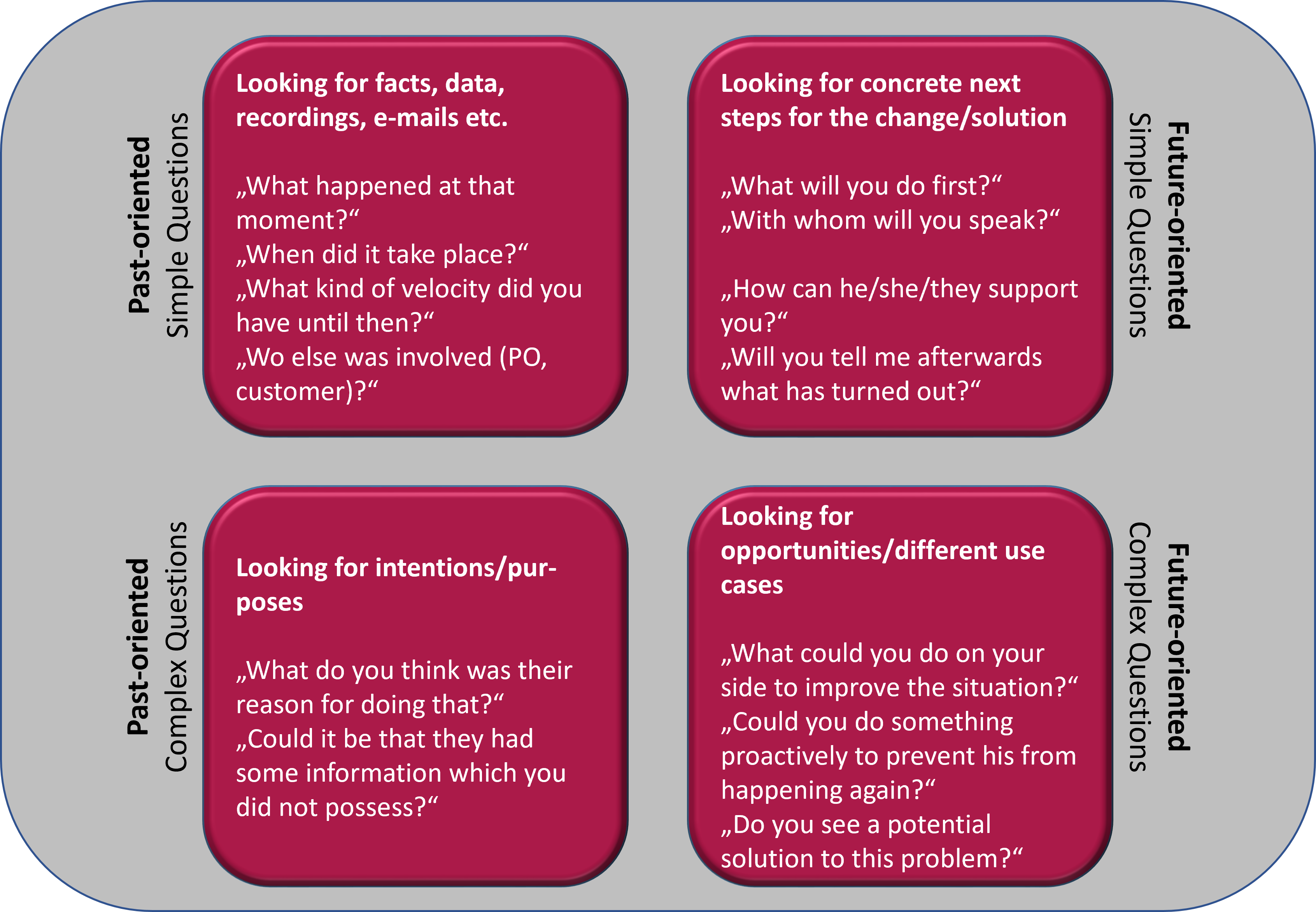 Future-oriented, simple questions are looking for concrete next steps for the change/solution