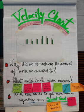 The Agile Master prints or draws the team's velocity chart from the last sprint. It has to be made visible, what initial amount of work was planned and how much of it was completed by the end of the sprint. You can also print or draw the cumulative flowchart of the last sprint, showing how much work is still in progress, how much has been completed, how much is still open, and how much is blocked. These categories can be personalized for each team (e.g. using the tool Jira Atlassian). Depending on the team's sprint results, the Agile Master writes down the following questions on the flipchart or whiteboard: